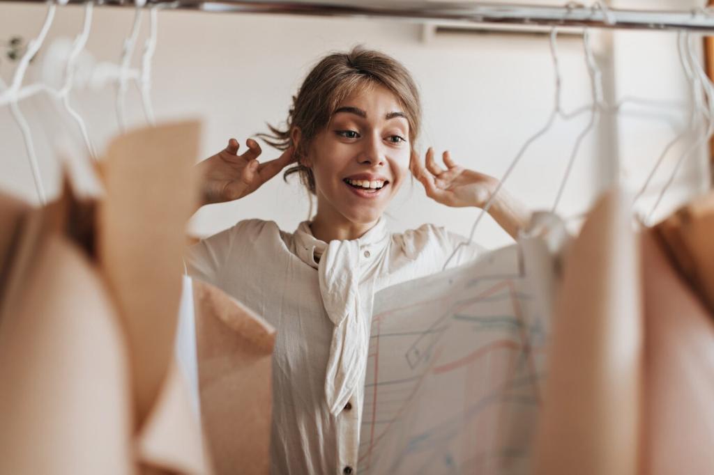 Ein kurzer Scan zeigt Herkunft, Verarbeitung und empfohlene Entsorgung. Ergänzen Sie Pflegehinweise für Accessoires, damit Verpackung und Produkt länger Freude bereiten. Abonnieren Sie unsere Updates mit neuen, frei nutzbaren Vorlagen für Materialpässe.